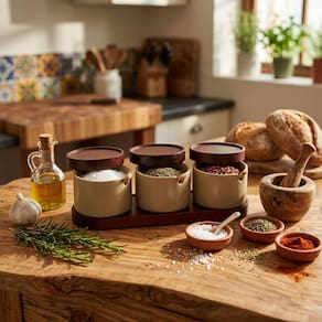 Conjunto de 3 Potes em Cerâmica com Base de Madeira - BTC Home Decor