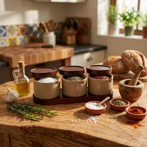 O conjunto de potes em cerâmica e madeira da BTC Home Decor é a união perfeita entre funcionalidade e elegância para a sua cozinha ou mesa de jantar. Composto por três potes de cerâmica em um sofisticado tom de bege mate, o conjunto apresenta tampas e uma base organizadora em madeira escura, que proporcionam um contraste moderno e acolhedor. Cada pote acompanha uma delicada colher de bambu e possui um encaixe perfeito na tampa, garantindo que seus temperos, condimentos ou conservas estejam sempre protegidos e à mão, adicionando um toque rústico e minimalista à decoração do seu ambiente. Informações básicas: Marca: BTC Home Decor Referencia: JI3008 Cor: bege e madeira natural Contem: 3 potes com 3 colheres e uma base Características: Material: cerâmica, madeira e bambu Medidas aprox.: 27,5 x 9,0 x 8,9 cm Especificações técnicas: Permitido uso no micro-ondas: sim/colher não Permitido uso no lava-louças: sim Garantia: contra defeitos de fabricação