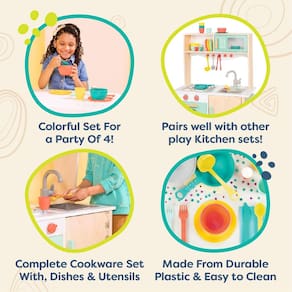 B. toys — Acessórios de cozinha Play — Utensílios de cozinha, pratos e utensílios — Conjunto de brinquedos de 33 peças para crianças — Brinquedos Pretend Play — 3 anos ou mais — Conjunto de cozinha Mini Chef — Acessórios de cozinha para crianças: cozinhe e brinque o dia todo com 33 brinquedos de cozinha coloridos e realistas! - Inclui: Este conjunto de jogos vem com uma panela, panela com tampa, peneira, pinça, concha, espátula, garfos, facas, colheres, pratos, tigelas, xícaras e saleiros e pimenteiros. - Brinquedos de fingir: brincar de fingir com esses acessórios de cozinha desperta a imaginação e promove a criatividade. - Adequados para crianças e duráveis: esses utensílios de cozinha são duráveis e fáceis de segurar e cozinhar para mãos pequenas. - Idade: esses brinquedos são recomendados para crianças de 3 anos ou mais