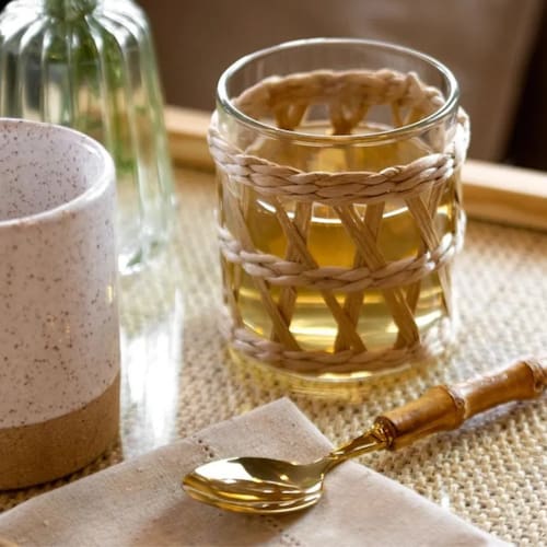 Sisal para Toque Natural; Os detalhes em sisal não apenas adicionam um charme único aos copos, mas também oferecem uma aderência confortável. Além disso, o sisal é um material durável, trazendo uma sensação de naturalidade e elegância.