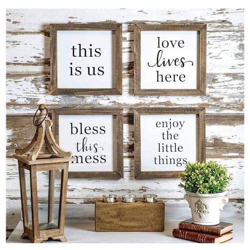 Este conjunto de quatro placas rústicas de madeira artesanais no estilo farmhouse traz uma atmosfera acolhedora e aconchegante para qualquer ambiente. Produzidas com molduras de madeira verdadeira e acabamento envelhecido, cada placa exala o charme rústico autêntico do estilo farmhouse. As letras impressas nas placas MDF resistentes exibem frases significativas como "this is us", "love lives here", "bless this mess" e "enjoy the little things", adicionando um toque pessoal e inspirador ao seu espaço.