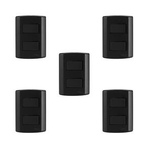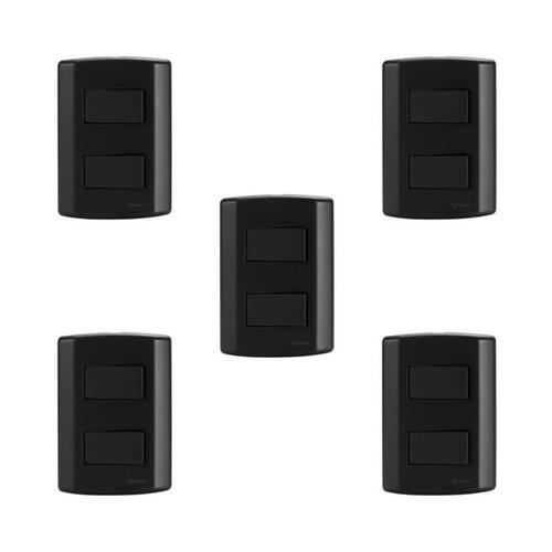 Com design sofisticado esse conjunto é utilizado para o acionamento manual da iluminação (liga/desliga) em diversos ambientes residenciais, comerciais ou industriais. As placas e teclas são produzidos em ABS e com tratamento anti-UV garantindo a cor e o brilho por muito mais tempo. Altura do Conjunto: 12.5 cm Ambiente: null Ambiente Principal: Sala de Estar Cor: Preto Cor Predominante: Preto Garantia do Fornecedor: 5 anos Informação Complementar: 5x Interruptor de 2 Teclas Simples, Modular, com Placa 4x2 e Suporte Preto Fosco Largura: 8.5 Altura: 12.5 Peso: 0.06900000000000001