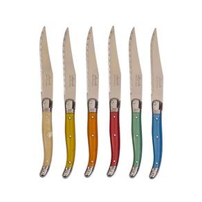Conjunto De 6 Facas Em Aço Inox Jean Neron Coloridas Inspiradas nas navajas espanholas, as facas Laguiole são produzidas no interior da França e trazem fama internacional à cidade. Como é de costume os restaurantes de Laguiole utilizar a mesma faca em todo o menu degustação, as lâminas microsserrilhadas foram especialmente projetadas para garantir o corte preciso de diversos tipos de alimento; legumes, frutas e carnes. Ainda conta com uma minuciosa abelhinha esculpida à mão, símbolo que se tornou marca registrada da Forge de Laguile. Ela faz referência ao selo imperial de Napoleão oferecido à vila em sinal de reconhecimento pela bravura em combate dos homens da . Garantia de sucesso à mesa e também uma ótima opção para presentear amantes da tradição técnica:- Código: 4089010002- Marca: Jean Neron- Conteúdo da Embalagem: 6 Facas- Material: Aço inox- Cor: - Peso: 480g- Dimensões: 2,5cm x 11,5cm x 27,5cm (AxLxP)- Garantia: 3 Meses - Contra de fabricação Sobre a Marca - Diz a lenda que Napoleão permitiu que os habitantes de Laguiole, uma cidadela da França, tivessem uma abelha em seu brasão para recompensá-los por sua bravura. Assim sendo, desde o século XIX, a marca Jean Néron vem conferindo a impressão de pequenas abelhas em suas tradicionais facas laguiole, perpetuando a história da por gerações até os dias de hoje. Garantia - 3 Meses - Contra de fabricação Mais Informações - Medidas aproximadas do gift box:Altura: 2,5cmLargura: 11,5cmComprimento: 27,5cmPeso: 480g Marca: Não Informado
