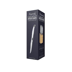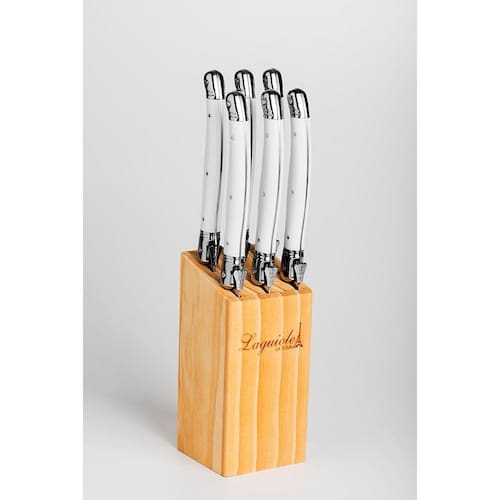 Toda a tradição das facas Laguiole é encontrada na linha Luxo. A lâmina é feita em aço inoxidável de altíssima qualidade com cabo em ABS branco. O conjunto de facas é entregue em um elegante cepo de madeira.
