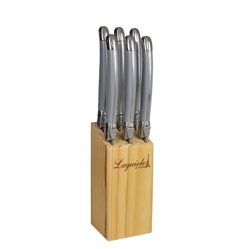 Toda a tradição das facas Laguiole é encontrada na linha Luxo. A lâmina é feita em aço inoxidável de altíssima qualidade com cabo em ABS bordeaux. O conjunto de facas é entregue em um elegante cepo de madeira.