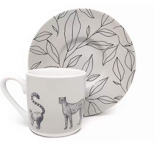 Xícara na Cor branca com estampa de animais da selva e folhas em azul, um charme. A Porcelana é altamente durável, higiênico, de fácil limpeza. Resistentes ao micro-ondas e máquina de lavar louças.