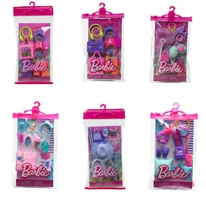 Esses conjuntos de acessórios da Barbie inspiram novos estilos e contos com 11 peças coloridas: escolha entre temas inspirados em doces, parques de diversões, festas do pijama e muito mais Inclui acessórios da moda, como chapéus, sapatos e bolsas, além de acessórios divertidos para contar histórias que embelezam o tema