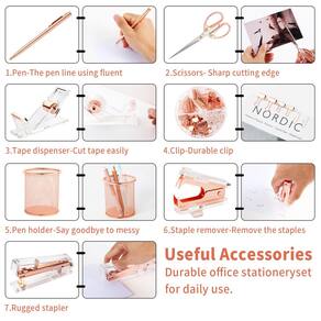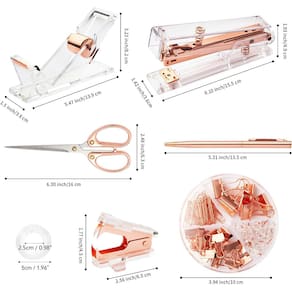 Organizadores e acessórios: você receberá um conjunto de organizadores e suprimentos de escritório delicados, incluindo 12 peças de material de escritório, conforme mostrado na imagem principal. Se você quiser adicionar alguns toques elegantes ao seu espaço de trabalho, o organizador de mesa de metal e os suprimentos se encaixam perfeitamente na conta. - Conjunto de material de escritório: 1 grampeador, 1 removedor de grampo, 1000 grampos, 1 suporte de fita, 1 suporte de caneta, 1 caneta, 1 tesoura, 1 fita transparente e 1 caixa de clipes de fichário; o tamanho dos acessórios de mesa: grampeador: 15 x 3,5 x 4,8 cm, dispensador de fita: 14 x 8 x 3,8 cm, removedor de grampos: : 4,5 * 6,5 cm, tesoura: 16 x 6,3 cm, caneta: 13,7 cm, suporte de caneta: 10 x 9 cm. Uma combinação completa de acessórios de mesa em ouro rosa é suficiente para atender às necessidades de sua escola e escritório. - Materiais de alta qualidade: feitos de acrílico e metal de alta qualidade, os acessórios de escritório em casa não são fáceis de quebrar ou deformar, resistentes e duráveis. Além disso, os clipes de fichário são antiferrugem e resistentes a impactos; o grampeador e o dispensador de fita têm almofadas antiderrapantes na parte inferior, muito adequadas para organizadores de mesa e acessórios. - Embeleze e arrume sua mesa: os acessórios de mesa não apenas melhoram a estética e a modernidade do escritório para relaxar a mente, mantendo a mesa limpa e organizada e melhoram a eficiência do trabalho, mas permitem que você tenha um ambiente confortável de aprendizagem ou escritório. Além disso, é adequado para muitas ocasiões, como escolas, escritórios, salas de reuniões, etc. - Embeleze sua mesa: os acessórios de mesa de escritório não são apenas elegantes e elegantes, mas também práticos. Melhora a estética e a modernidade do seu escritório enquanto mantém sua mesa arrumada e organizada. Este kit de acessórios modernos elegantemente projetado vem em lindo ouro rosa e dourado, adequado como um presente elegante para amigos ou colegas. - Excelente atendimento ao cliente: se você tiver alguma dúvida sobre nossos acessórios de mesa e organizadores de espaço de trabalho, . Você pode comprar com confiança. Ao mesmo tempo, se você tiver algum comentário ou sugestão, pode nos informar, para que tenhamos a oportunidade de melhorar nossos produtos e oferecer melhores serviços.