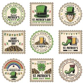 Desenhos vintage com tema irlandês — Inclui 9 adesivos de vinil exclusivos em estilo selo postal, com motivos clássicos do Dia de São Patrício, como trevos, chapéus de duende, botas, moedas de ouro, canecas de cerveja e bandeiras irlandesas. Vinil impermeável durável — Feito de material de vinil premium que é à prova d'água e de longa duração, perfeito para uso interno e externo em garrafas, envelopes, sacolas de presentes ou álbuns de recortes. Fácil de usar e sem resíduos — basta descascar e colar na maioria das superfícies lisas. Fácil de remover sem rasgar ou deixar marcas adesivas. Perfeito para as celebrações do Dia de São Patrício — Ideal para eventos temáticos irlandeses, desfiles de 17 de março ou noites festivas em bares — decore copos, embalagens, cartões ou eventos. Pacote compacto e leve — Cada decalque mede entre 5 e 8 cm, o peso total do conjunto é de 40 a 45 g, fácil de transportar e armazenar para projetos sazonais de artesanato ou bricolage.