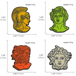 Material: liga Tamanho: 2,2 x 3,1 cm Peso: 40 g Quantidade: você receberá todas as peças em quantidade igual à primeira foto principal. Tema mitológico exclusivo — Apresenta quatro figuras icônicas das lendas gregas: Prometeu, Medusa, Dionísio e Aquiles, tornando cada broche uma obra de arte vestível. Estilo versátil — Funciona como alfinetes de blusa, broche, alfinetes de lapela ou crachás, adequados para jaquetas, vestidos, uniformes, mochilas e figurinos de palco. Artesanato em liga durável — Feito de liga de alta qualidade com revestimento de esmalte, garantindo linhas claras, cores vibrantes e durabilidade duradoura sem desbotar. Declaração artística de moda — acessório perfeito para quem ama história, mitologia ou moda ousada, adicionando personalidade a qualquer roupa. Tamanho compacto e leve — cada pino mede aproximadamente 2,2 x 3,1 cm, é fácil de colocar e usar confortavelmente, além de apresentar um artesanato detalhado.