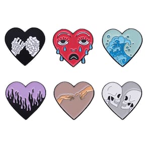 Material: liga. Tamanho: 3 x 2,8 cm Peso: 25 g Quantidade: você receberá todas as peças em quantidade igual à primeira foto principal. ShowUnique Heart Designs — O conjunto inclui 6 broches criativos em forma de coração com esqueleto, rosto chorando, ondas do mar, chama roxa, gestos artísticos com as mãos e padrões de casais de caveiras. Material de liga durável — Feito de liga de qualidade com revestimento de esmalte liso, resistente ao desbotamento e projetado para uso duradouro. Tamanho e peso perfeitos — Cada alfinete mede 3 x 2,8 cm, leve e resistente, pesando 25 g, facilitando o uso sem danificar os tecidos. Estilo versátil — funciona como alfinetes de blusa, broche de lapela ou crachá; ideal para jaquetas jeans, mochilas, chapéus e roupas do dia a dia para mostrar um estilo alternativo e artístico. Ótimo para ocasiões — Adequado para shows, Halloween, festas temáticas, cosplay ou acessórios de moda diários para quem adora designs criativos e expressivos.