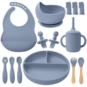 - Conjunto de alimentação para bebês: faça com que seu bebê ame a hora das refeições e libere as mãos da mãe! Este conjunto de alimentação de 14 peças inclui 1 prato dividido por sucção, 1 tigela de sucção, 1 garfo de madeira, 1 colher de bebê de madeira, 1 copo de palha, 1 canudo à prova de derramamento, 1 babador para bebês com um bolso de proteção, 1 garfo infantil de primeiro estágio, 1 colher infantil de primeiro estágio, três colheres de treinamento e 3 escovas de dente de dedo.