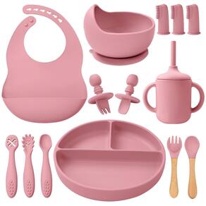 - Conjunto de alimentação para bebês: faça com que seu bebê ame a hora das refeições e libere as mãos da mãe! Este conjunto de alimentação de 14 peças inclui 1 prato dividido por sucção, 1 tigela de sucção, 1 garfo de madeira, 1 colher de bebê de madeira, 1 copo de palha, 1 canudo à prova de derramamento, 1 babador para bebês com um bolso de proteção, 1 garfo infantil de primeiro estágio, 1 colher infantil de primeiro estágio, três colheres de treinamento e 3 escovas de dente de dedo.