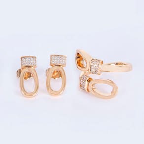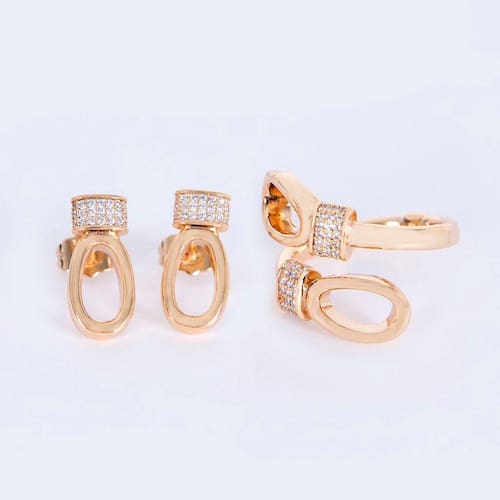 Conjunto de brincos e anel banhados a ouro e com detalhes em zircônias cristais, luxuoso que te deixa em destaque em qualquer situação.