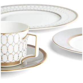 Adicione sofisticação à sua mesa com o conjunto de jantar Wedgwood Renaissance Grey de 5 peças. Composto por três pratos, um pires de chá e uma xícara de chá, este conjunto é feito em porcelana fina de osso e adornado com um elegante padrão cinza e dourado, criando uma atmosfera de requinte e classe.