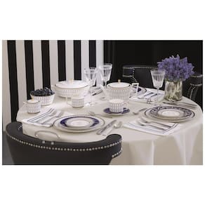 Este conjunto inclui prato de jantar, prato de salada, prato de sobremesa, prato de pão e manteiga, xícara de chá e pires de chá, todos feitos em porcelana fina. Cada peça é decorada com um acabamento azul Wedgwood vibrante e adornada com detalhes dourados intrincados, além de uma borda de louro neoclássica inspirada nos padrões históricos dos arquivos da marca, que adicionam um toque de luxo atemporal.