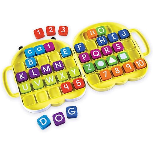 . Caso de transporte amigável de abelhas abre para revelar um conjunto de atividades de aprendizagem de três em um SETDEVELOP: Crianças constr reconhecimento de letras, números e formas com conjunto de atividades de abelhas que também aumenta as habilidades motoras finasPORTÁVEL: Alça robusta e trava para que as crianças possam aprender com eles onde quer que eles vão. Inclui 41 peças: 1 estojo de abelha, 40 azulejos multicoloridos com letras maiúsculas e minúsculas, números e 4 formas popularesUNPLUGGED PLAY: Os blocos ABC são maiúsculas de um lado e minúsculas do outro e se encaixam em divots individuais. cartões de atividade oferecem aulas e sugestões educacionais divertidas para expandir o aprendizado de suprimentos de escola para crianças de 2 anos