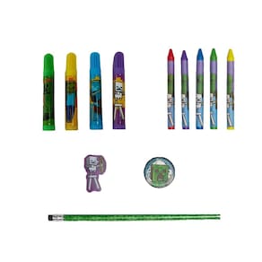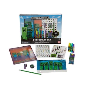 - Conjunto de presente de arte Minecraft – Nosso conjunto de atividades de arte infantil mais popular, este conjunto completo de 30 peças. O conjunto de material escolar e arte de colorir Minecraft para crianças inclui 4 marcadores, 5 giz de cera, um estojo macio para lápis, um número 2 lápis, um apontador de lápis, uma borracha, um bloco de desenho de 10 peças e 2 folhas de adesivo.