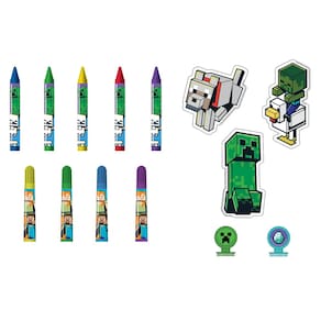 - Conjunto de presente de arte MINECRAFT: este conjunto com tema Minecraft para crianças inclui um caderno espiral de 12,7 x 12,7 cm, 5 giz de cera, 4 marcadores, 3 adesivos grandes, 2 folhas de adesivos e 2 carimbos autotintantes.