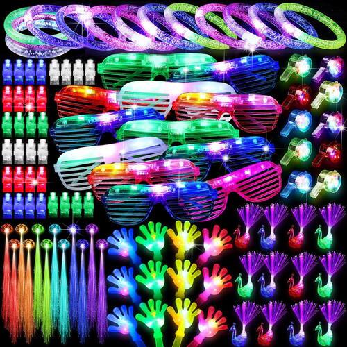 122 peças de suprimentos de festa que brilham no escuro, brinquedos iluminados, lembrancinhas de festa, suprimentos intermitentes, conjunto com 12 óculos intermitentes, pulseiras de LED, cabelos intermitentes, neon, pavão, luz de dedo, LED, apito, badalo e 50 luzes de dedo.