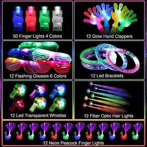 - Pacote prático: os suprimentos para festas que brilham no escuro são um total de 122 peças, incluindo 12 peças de 6 óculos brilhantes com obturador de LED de cores diferentes, 12 peças de pulseiras de LED de acrílico, 12 cores de 50 peças de luzes de dedo, 12 apitos LED transparentes, 12 luzes de dedo de pavão e 12 peças de badalo brilhantes de 9,45 polegadas; a quantidade é abundante para atender às necessidades de sua festa iluminada