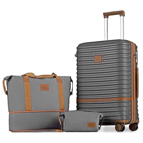 Joyway Mala expansível de 61 cm com roda giratória, conjunto de bagagem rígida de 3 peças com trava TSA - Conjunto de bagagem de 3 peças: este conjunto de malas inclui bagagem despachada de 61 cm e uma bolsa de viagem e uma bolsa de higiene. Totalmente equipado para todas as suas necessidades de viagem. - Capacidade expansível: projetado com uma camada expansível para adicionar 15% mais espaço à sua bagagem de mão. - Viagem segura: nossa bagagem rígida é feita principalmente de material ABS, que é leve e mais durável. Montado com trava TSA para proteger sua privacidade e manter seus pertences seguros. - Fácil de manobrar: as rodas giratórias de 360 graus oferecem grande manobrabilidade em várias direções. Com a alça telescópica de alumínio, você pode se mover sem esforço e com menos impacto no seu pulso. - Organizador de bagagem portátil: o interior da bagagem usa divisórias com zíper e bolsos organizadores cruzados para evitar itens soltos e bagunçados. Equipado com zíperes YKK de camada dupla com forte desempenho antiexplosão.