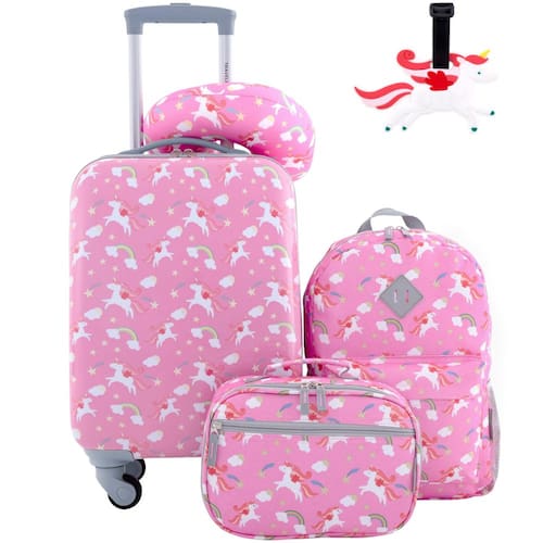 Travelers Club Conjunto de bagagem infantil de 5 peças, Unicórnio, Conjunto de bagagem infantil de 5 peças - Conjunto de viagem infantil de 5 peças: bagagem de mão rígida de 45,7 cm, mochila de 38 cm, lancheira de 25,4 cm, almofada de pescoço, etiqueta de bagagem - Cores e padrões combinando - Mala de transporte: Tamanho de cabine, 4 rodas, lado rígido - Travesseiro de viagem: Feito de tecido de elastano com micro contas