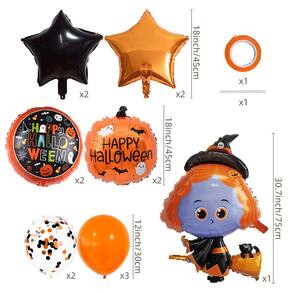 Conjunto completo de balões de Halloween — Inclui balões em forma de bruxa, abóbora, morcego e estrela em tons de laranja, preto e dourado para uma atmosfera divertida e festiva. 🧙? Design exclusivo de bruxa de desenho animado — Apresenta uma adorável peça central de balão de papel alumínio que aprimora qualquer configuração de Halloween com um charme sazonal divertido. 🦇 Materiais mistos duráveis — Feito de filme de alumínio premium e látex para resistência, elasticidade e retenção de cores vibrantes durante todo o evento. Perfeito para decoração de festas — Ideal para festas de Halloween, eventos em casas mal-assombradas, exibições em salas de aula ou celebrações temáticas internas e externas. Fácil de inflar e reutilizar — Pode ser preenchido com ar ou hélio usando uma bomba manual; simples de pendurar, combinar ou reutilizar em várias temporadas de Halloween.