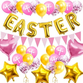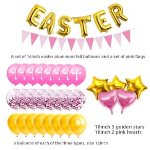 Tema festivo da Páscoa: este conjunto de balões de 36 peças apresenta lindos balões rosa e dourados com designs temáticos da Páscoa, incluindo cruzes e confetes, perfeitos para a celebração da Páscoa. Variedade de designs de balões: inclui balões de alumínio com letras “PÁSCOA”, balões em forma de coração, balões em forma de estrela e balões de confete de látex, criando uma atmosfera vibrante e alegre. Materiais de alta qualidade: feitos de látex, papel alumínio e papel duráveis, garantindo que suas decorações permaneçam intactas e adicionem um toque festivo à sua festa. Perfeito para celebrações religiosas: ideal para eventos da igreja de Páscoa, reuniões religiosas e festivais de primavera, tornando-o uma ótima maneira de celebrar a temporada. Fácil de configurar: o conjunto vem com todos os itens essenciais para sua celebração, e os balões são fáceis de inflar e pendurar para uma configuração de festa rápida e conveniente.