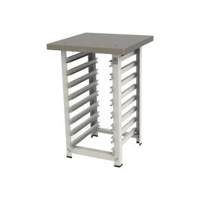 Essa bancada serve para organizar e otimizar o espaço de trabalho na produção de alimentos, como pães e bolos. Ela permite armazenar até 8 assadeiras do forno PRP-004,