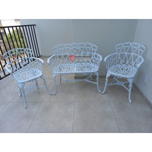Especificações: 2 Poltronas: 83 cm de altura x 41 cm de profundidade x 55 cm de largura. 1 Banco de 2 lugares: 83 cm de altura x 41 cm de profundidade x 97 cm de comprimento. Cor: Branco. Material: Alumínio fundido. Tipo de pintura: Eletrostática. Vendemos almofadas separadamente. Requer montagem.