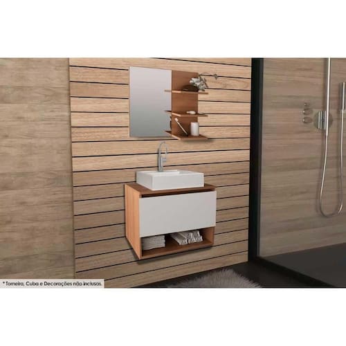 Conjunto de Banheiro Armário c/ Espelho BN3608 e Balcão Suspenso BN3606 s/Cuba Pia 60cm cor Amêndoa - Tecno Mobili Abaixo segue os produtos do KIT: Conjunto de Banheiro Armário c/ Espelho BN3608 e Balcão Suspenso BN3606 s/Cuba Pia 60cm cor Amêndoa - Tecno Mobili Gabinete de Banheiro Suspenso BN3606 1 Porta 60cm cor Amêndoa/Branco - Tecno Mobili