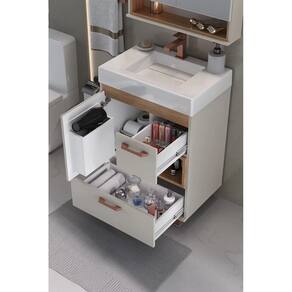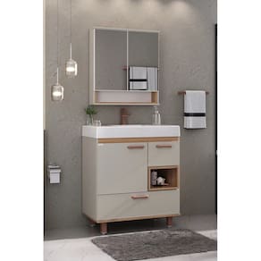 O Conjunto Mariana é um lançamento super versátil da Fabribam. A cor Nude, suave e contemporânea, junto aos detalhes em Catedral, para combinar, o móvel vai com pés e puxadores na cor cobre, o que adiciona um toque de sofisticação. Reparou no nicho? É perfeito para armazenar toalhas, produtos de higiene pessoal ou decorações. O Gabinete Mariana é robusto e oferece ótimo aproveitamento de espaço com duas gavetas com corrediça telescópica e conta com um diferencial: uma porta com suporte para secador de cabelo, o que o torna ainda mais funcional para o uso diário. O conjunto inclui a espelheira Mariana, na mesma cor Nude, complementada pelo tom Catedral, que dispõe de duas portas com espelhos amplos, sistema de fechamento com amortecedor e prateleiras internas espaçosas. Para complementar, o Lavatório, com seu design contemporâneo, acrescenta um toque final de sofisticação ao conjunto. Sem dúvida, é a escolha ideal para quem deseja renovar o banheiro com elegância, praticidade e um toque de modernidade.