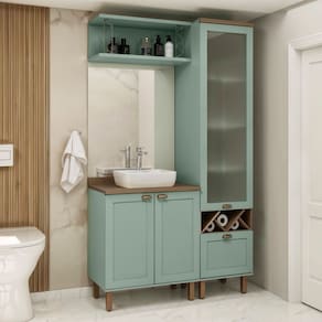 O produto NÃO acompanha cuba nem espelho. Acabamento da Gaveta: BP Acabamento da Porta: BP Acabamento da Prateleira: Pintura Acabamento dos Pés: Pintura Altura dos Pés: 17 cm Ambiente Principal: Banheiro codigo_ean: 7900288261977 Complexidade da Montagem: Alta: deve ser montado por um montador especializado Cor: Verde Mint/Ébano Fosco Cor do Produto: Verde Mint/Ébano Fosco Cor Flex: Não Cor Interna: Verde Mint Escala de Brilho: Fosco Escala de Brilho da Gaveta: Fosco Escala de Brilho da Porta: Fosco Escala de Brilho da Prateleira: Fosco Gaveta com Chave: Não Informações Complementares: Conjunto de Banheiro Modulado 100% MDF Americano 3 Peças com Armário de Vidro Itens Inclusos: 1 Conjunto para Banheiro, Kit Ferragens e Manual de Montagem Linha ou Coleção: Iluminata Manual de Montagem e Instalação: https://product-hub-prd.madeiramadeira.com.br/518231063/documents/6b243de7-512e-4dc0-a83f-32f62094abe132711847341760364846255.pdf Marca: Genialflex Material da Gaveta: MDF Material da Porta: MDF Material da Prateleira: MDF Material do Puxador da Gaveta: ABS Material do Puxador da Porta: ABS Material dos Pés: ABS Material Principal: MDF Montagem Flex: Não Necessita Montagem: Sim Origem do Produto: Nacional Pés Reguláveis: Sim Peso: 113 kg Peso Máximo por Gaveta: 5 kg Peso Máximo por Prateleira: 5 kg Possui Espelho: Não Possui Pés: 08 Possui Portas: 03 Possui Prateleiras: 04 Possui Rodízio: Não Recomendações de Uso, Manutenção e Limpeza: LIMPAR COM PANO UMEDECIDO E NUMERO DAS PEÇAS RETIRAR COM ALCOOL Sapatas Niveladoras: Não Sistema de Montagem: Parafusos e Cavilhas e minifix Suporta Até (kg): 50 kg Tipo de Corrediça da Gaveta: Metálica Telescópica Tipo de Dobradiça/Corrediça da Porta: Metálica Tipo de Porta: Bater Tipo de Puxador da Gaveta: Externo Tipo de Puxador da Porta: Externo