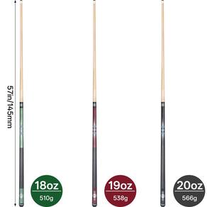 - Bastão de bilhar : Comprimento do taco: 147 cm (comprimento padrão); Pesos do taco: 18, 19, 567 g, ponta de taco de 13 mm; leve, mas sólida, amigável para jogadores homens/jovens/senhoras/crianças