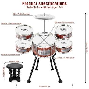 Você ainda está procurando brinquedos para crianças? Brinquedos que permitem que eles aprendam coisas enquanto brincam? Nosso conjunto de bateria infantil completo com 5 tambores (tambor grande de 2,5 x 22 x 12,4 cm, 5 x 16 cm x 6,6 cm, tambor médio de 5 x 12 cm x 5,5 cm), 1 banco, 1 prato e 2 baquetas de bateria, permitindo que seu filho aprenda um instrumento musical facilmente enquanto joga. Nosso conjunto de bateria de brinquedo é um bom brinquedo de iluminação musical que pode cultivar seus talentos musicais, exercitar suas habilidades de coordenação mão-olho, estimular sua criatividade, habilidades motoras e coordenação olho-mão, e deixá-los se apaixonar pela música enquanto tocam e se apresentam. Por que recomendar que você escolha nosso brinquedo de teclado de piano? Damos grande importância a todos os detalhes do produto! Não somos apenas este kit de bateria de brinquedo, a M SANMERSEN é uma loja de brinquedos profissional, há muitos brinquedos adequados para presentes, você pode escolher. Características do produto: - O kit de bateria infantil é um brinquedo especialmente projetado para crianças. - O conjunto de bateria montado tem cerca de 59,9 cm de altura, adequado para crianças. - O tambor de jazz é um brinquedo educativo com funções de entretenimento e aprendizagem. Pode ser utilizado como presente de aniversário da criança/Dia das Crianças/Natal para inspirar as habilidades musicais de pequenas estrelas do rock. - Os tambores de jazz infantis ajudam a estimular a criatividade, a imaginação e o talento musical das crianças. Seu filho será capaz de se divertir enquanto desenvolve habilidades básicas! Lista de pacotes 5 tambores 1 prato 2 baquetas. - [Conjunto de bateria profissional e resistente] O conjunto de bateria infantil vem com 5 tambores (tambor grande de 2,5 x 22 x 12,4 cm, 5 x 16 x 6,6 cm, tambor médio de 5 x 12 cm x 5,6 cm), 1 banco, 1 prato, 2 baquetas montadas. bateria é sobre 60 cm de altura, especialmente projetado para crianças. E como os pés do tambor são tratados com ventosas, eles são relativamente fortes. - [Brinquedo divertido e educativo] Este é um brinquedo educativo musical muito bom, que pode efetivamente reduzir o tempo das crianças em contato com produtos eletrônicos, permitir que as crianças cresçam saudáveis e felizes e promova o desenvolvimento completo das crianças. E este conjunto de bateria de rock jazz é bem feito e pode suportar o entusiasmo de jovens bateristas enquanto mantém um desempenho duradouro. - [Fácil instalação em 10 minutos] Não são necessárias ferramentas de montagem adicionais e pode ser facilmente instalado seguindo as etapas de montagem em 10 minutos. O conjunto de bateria é feito de liga, plástico e papelão, o que é muito leve. Com design de encaixe, a instalação é muito simples. O tambor de jazz é um brinquedo educativo com funções de entretenimento e aprendizagem, para que seu filho possa se divertir enquanto desenvolve habilidades básicas! - [Favorito da Little Rock Star] A bateria infantil é um excelente brinquedo para meninos/meninas de 3/4/5/6 anos de idade, especialmente para crianças que gostam de rock and roll, crianças que o possuem parecem ter realmente se tornado uma pequena estrela do rock. Durante festivais como Halloween, Natal e aniversários, as crianças podem usar o kit de bateria para criar uma atmosfera de festa feliz. - [Detalhes visíveis e qualidade] A cabeça do tambor passou por testes rigorosos de percussões repetidas para garantir seu desempenho antipercussivo. A cabeça do tambor é atualizada, o som de bater na cabeça do tambor é mais claro e mais alto e a musicalidade é bastante melhorada. Além disso, as baquetas infantis são equipadas com uma esponja de borracha na cabeça, o que economiza esforço ao brincar e reduz o impacto nas mãos das crianças.