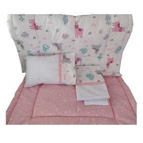 Nosso kit de cuna Colecho, está apto para colchones cuja medida máxima é de 90x55x10 centímetros. (Largo-ancho-alto) Son confeccionados a mano, con los mejores materiales, para que su bebé este cómodo al momento de descansar en su cuna.El Set Incluye:Sabana blanca superior de 200 hilos, con aplicación al tono del cobertor.Sabana blanca bajera de 200 hilos, con elástico en cada una de las almohadas esquinas.Funda de cor branca de 38x22 cm (aprox), con aplicación al tono del cobertor.Almohada rellena con algodón hipoalergénico.Cobertor acolchado, con tela de algodón Crea por un lado y por el otro Lona Española.