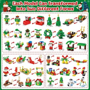 -?Modo de Transformação Mágica?Cada dia da contagem regressiva de 24 dias de Natal traz um novo desafio com 1 miniedifício, cada um oferecendo dois designs criativos. 6 em 1 faz uma grande árvore de Natal, 6 em 1 faz um grande trem de Natal, 12 em 1 faz um grande trenó de renas, um total de 51 formas