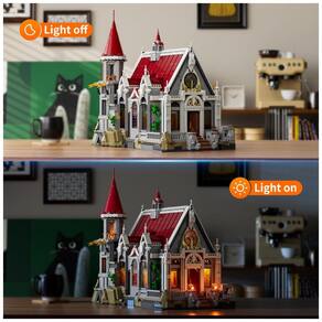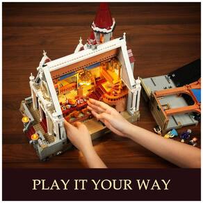 O conjunto integra sistema de iluminação com 15 pontos de LED distribuídos em vitrais e tochas, proporcionando efeito de luz atravessando janelas coloridas e criando destaque visual no diorama medieval. O kit acompanha minifiguras de rei, membros da família real e personagens de serviço, além de mesa longa com alimentos, estandartes e elementos decorativos para cenas de banquete.??