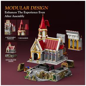 Conjunto de blocos de montar para adultos e adolescentes com 3209 peças que reproduz a tesouraria de um castelo medieval, com volumetria em formato em L, torres, vitrais coloridos, contrafortes e detalhes em pedra e dourado. A construção combina elementos funcionais e decorativos típicos da arquitetura medieval, como arcos ogivais, abóbadas e janelas com vitrais em múltiplas cores.?