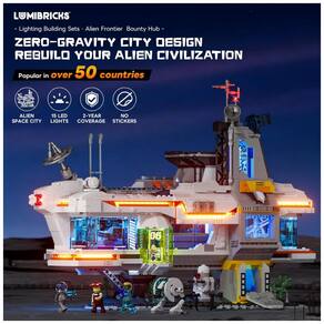 Conjunto de blocos de montar para adultos e adolescentes com 2309 peças que representa um centro de recompensas em planeta alienígena de alta tecnologia, parte da série temática Alien Frontier. A estrutura é baseada em uma nave desativada elevada por suportes específicos, formando um volume superior destacado do solo com silhueta futurista em estilo cyberpunk.?