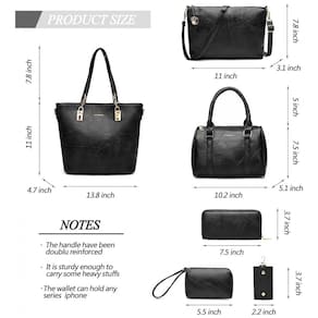 Dimensões do conjunto de bolsas bolsa grande 35,05 centímetros x 12,7 centímetros x 27,94 centímetros A bolsa Boston 25,4 centímetros x 12,7 centímetros x 19,05 centímetros A bolsa de corpo 27,94 centímetros x 10,92 centímetros x 19,81 centímetros Bolsa de mão 13,97 centímetros x 10, bolsa de cartão 6,86 centímetros x 10,92 centímetros