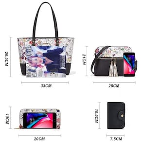 Material Couro Sintético tecido, Poliéster forro. Tamanho Bolsa grande 33 x 26,5 x 12,69 centímetros, Bolsa transversal 26 x 9,49 x 19 centímetros, Carteira 20 x 10 x 3 centímetros, Porta cartão 10,5 x 7,5 x 1 centímetros. Peso total cerca de 1,05 kg. Por favor, você pode consultar o tamanho antes de comprá lo. Obrigado. Bolsos Um compartimento principal com zíper, um bolso interno com zíper, um bolso traseiro e dois bolsos embutidos. 4 peças uma bolsa grande uma bolsa mensageiro bolsa carteira porta cartões. Perfeito para namorar, fazer compras, trabalhar, viajar, vocação, festa e outras ocasiões e manter seus itens diários bem organizados. Material de ótima qualidade, super fofo e tamanho perfeito. Bem feito e muito resistente Marca: Não Informado