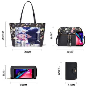 Material Couro Sintético tecido, Poliéster forro. Tamanho Bolsa grande 33 x 26,5 x 12,69 centímetros, Bolsa transversal 26 x 9,49 x 19 centímetros, Carteira 20 x 10 x 3 centímetros, Porta cartão 10,5 x 7,5 x 1 centímetros. Peso total cerca de 1,05 kg. Por favor, você pode consultar o tamanho antes de comprá lo. Obrigado. Bolsos Um compartimento principal com zíper, um bolso interno com zíper, um bolso traseiro e dois bolsos embutidos. 4 peças uma bolsa grande uma bolsa mensageiro bolsa carteira porta cartões. Perfeito para namorar, fazer compras, trabalhar, viajar, vocação, festa e outras ocasiões e manter seus itens diários bem organizados. Material de ótima qualidade, super fofo e tamanho perfeito. Bem feito e muito resistente Marca: Não Informado