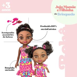 A boneca Juju Mommy Mamãe e Filhinha traz todo o e magia para a brincadeira das crianças. Com elas, as crianças podem brincar de Mamãe e Filhinha de forma realista, já que uma é a cara da outra. Além de lindas, as bonecas possuem acessórios encantadores que tornam a brincadeira ainda mais diida, permitindo que a imaginação das crianças voe solta.