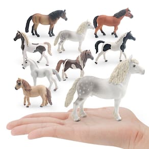Conjunto de 8 peças de bonecos de cavalos selvagens — modelos realistas de pôneis árabes, galeses e islandeses em PVC, estatuetas de animais de fazenda, brinquedos educativos para crianças, 2,5 a 12,6 cm Descrição: Material: PVC Tamanho: 2,5 a 12,6 cm Peso: 650 g Características: Coleção Diverse Horse: Este conjunto inclui 8 estatuetas de cavalos exclusivas, com pôneis árabes, galeses e islandeses, todas feitas com detalhes impressionantes e realistas. Seguros e duráveis: feitos de PVC de alta qualidade, esses modelos de cavalos são duráveis, não tóxicos e seguros para crianças de 3 anos ou mais se divertirem durante as brincadeiras. Educacionais e divertidas: essas estatuetas ajudam as crianças a desenvolver o reconhecimento animal, a imaginação e as habilidades cognitivas enquanto exploram o mundo dos cavalos selvagens. Perfeitas para exibição: um ótimo complemento para a coleção de qualquer amante de cavalos, essas estatuetas também podem ser usadas para fins educacionais ou como decoração para espaços temáticos. Ideal para crianças de 3 anos ou mais: essas estatuetas de cavalos são perfeitas para bebês e crianças que gostam de brincar com imaginação e aprender sobre diferentes raças de cavalos. O que vem na caixa: 8 x Conjunto de bonecos Wild Horse