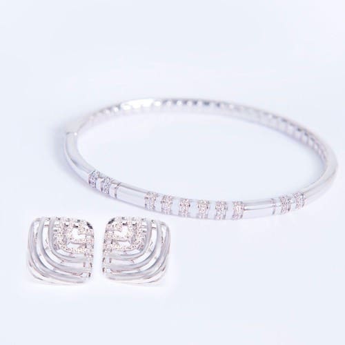 Conjunto de bracelete e brincos em ródio branco com aplicação de zircônias cristais é luxuoso e que te deixa em destaque em qualquer situação.