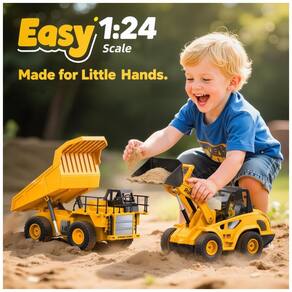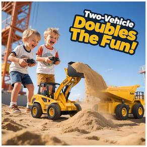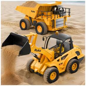Este conjunto de construção RC 2 em 1 da Ruko inclui 1 Caminhão Basculante controlado por controle remoto e 1 Pá Carregadeira, cada um com seu próprio controle. Vem com 4 baterias de caminhão de íon de lítio recarregáveis de 3,7V com duração de 30 minutos por bateria. Pilhas AA de 1,5V para os controles remotos não estão incluídas. Comande a ação no canteiro de obras com 9 canais realistas, simulando movimentos de levantar, bascular e controlar o balde. Ambos os veículos possuem luzes, sons e direção multidirecional para uma diversão imersiva na construção. O sistema de direção oferece um controle suave, com sistema de direção simulado e controles remotos de 2,4GHz para uma direção responsiva, livre de interferências. As crianças podem operar ambos os veículos ao mesmo tempo, ideal para trabalho em equipe ou brincadeira solo. Com design durável e escala 1:24, esses brinquedos são robustos para brincar tanto dentro quanto fora de casa. A Pá Carregadeira mede 27 x 10,5 x 12,7 cm, e o Caminhão Basculante 19,8 x 11,2 x 10,9 cm. Proporções realistas, pneus antiderrapantes e motores potentes os tornam ideais para escavar, transportar ou aventuras no quintal. Um excelente presente para crianças, estimula o aprendizado STEM, a criatividade e a coordenação prática. Ótimo para meninos e meninas que adoram caminhões de construção, tratores e ação controlada remotamente.