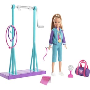 Barbie Boneca Team Stacie e conjunto de ginástica com barra giratória e 7 acessórios temáticos para crianças de 3 a 7 anos