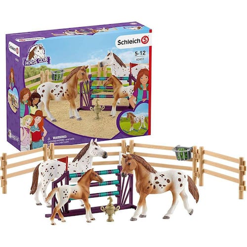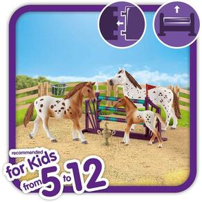 Explore o mundo animado de Lakeside com o treinamento do torneio da Lisa com Appaloosas, um divertido e educativo brinquedo de Schleich! Este conjunto de 2.047" x 9.646" x 7,48" é autenticamente detalhado, e é ideal para horas de jogo imaginativo. Cercas de paddock e salto de obstáculo reconfiguram para múltiplas opções de jogo! 11 peças.